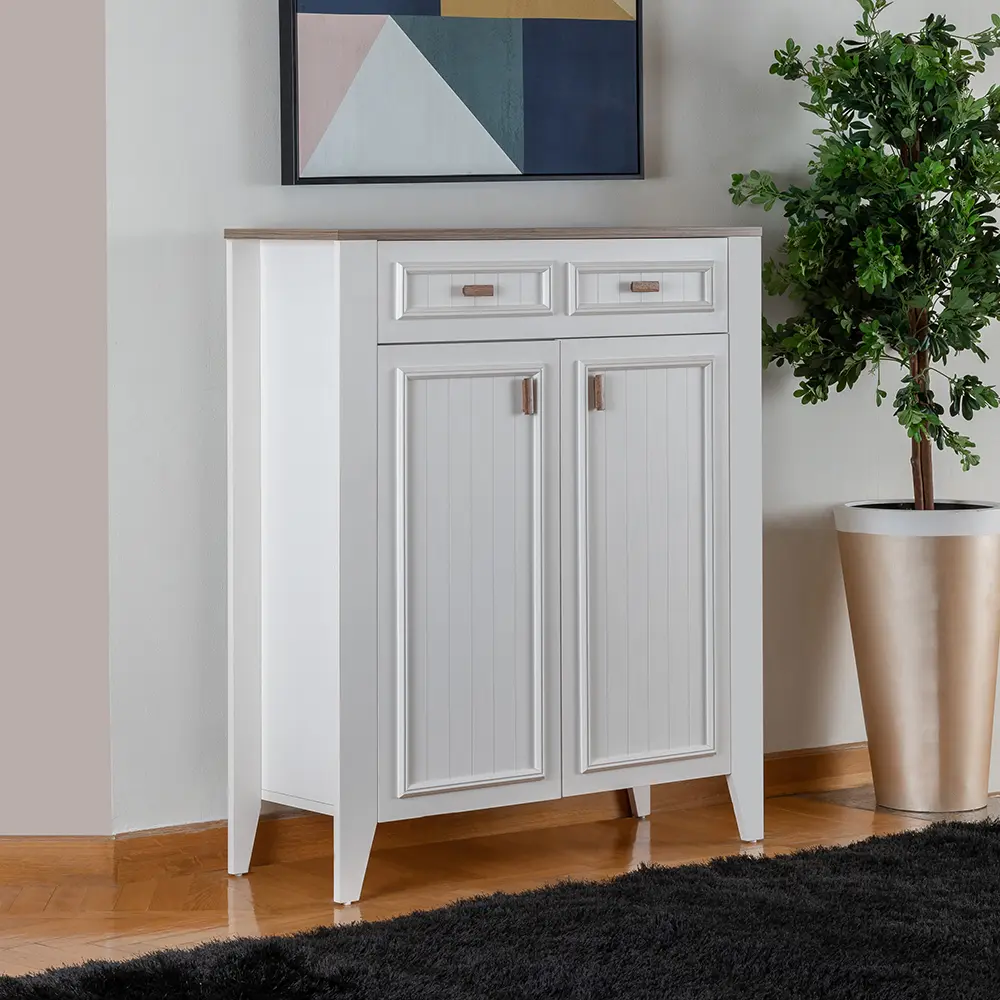 A new, elegant and more practical shoe rack with a drawer for storing various items.